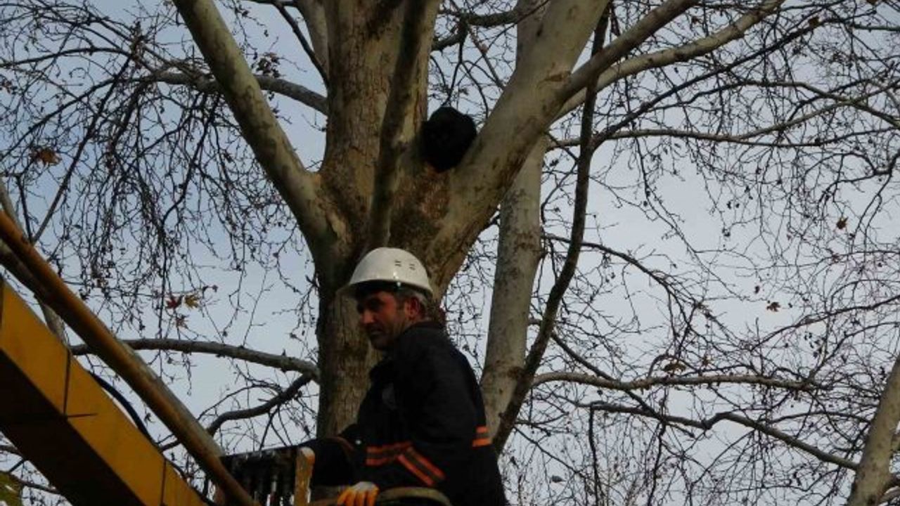 Adana'nın Kozan ilçesinde bir çınar ağacında 3 gündür mahsur kalan kedi, park bahçe ekiplerinin fark etmesi üzerine kurtarıldı.