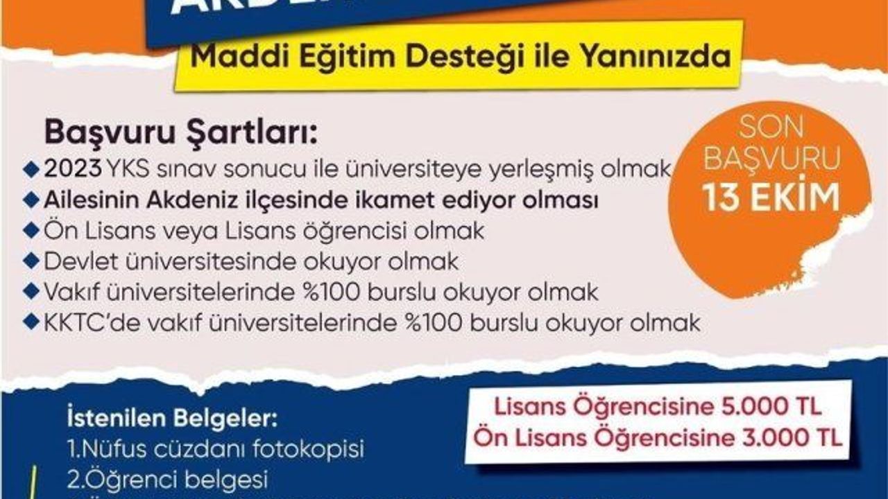 Akdeniz Belediyesinin sağlayacağı eğitim desteğinden faydalanmak için gereken şartlar ise şöyle; "2023 YKS sonucu ile üniversiteye yerleşmiş olmak. Ön lisans veya lisans öğrencisi olması. Ailesinin Akdeniz ilçesinde ikamet ediyor olması. Devlet üniversitesinde okuyor olmak. Vakıf üniversitelerinde yüzde 100 burslu okuyor olmak. KKTC'de vakıf üniversitelerinde yüzde 100 burslu okuyor olmak."