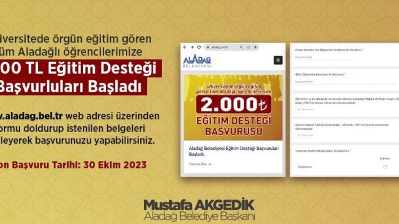 Aladağ Belediye Başkanı Mustafa Akgedik, geçen yıl verdikleri bursu bu yıl da vereceklerini söyledi. Akgedik, kendisi ya da ailesi Aladağ'da ikamet eden ve örgün olarak herhangi bir üniversitede okuyan öğrencilerin 2 bin liralık eğitim yardımından yararlanacağını açıklayarak, "Sevgili gençler, bu yıl da Aladağlı tüm örgün okuyan üniversite öğrencilerimize eğitim yardımı yapacağız. Başvurular 5 Ekim'de başladı geç kalmadan başvurularınızı yapın" dedi.