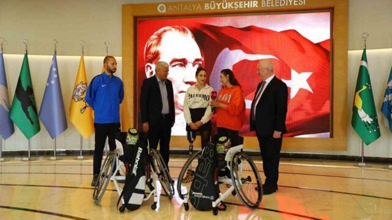 Antalya Büyükşehir Belediyesi, Tekerlekli Sandalye Tenis Milli Takımı'nın Antalyalı sporcuları Çiğdem Sayın ve Esra Bozdemir Işık'a ekipman desteğinde bulundu. Yeni tenis tekerlekli sandalye ve raketlerine kavuşan engelsiz sporcular, Başkan Böcek'e destekleri için teşekkür etti.