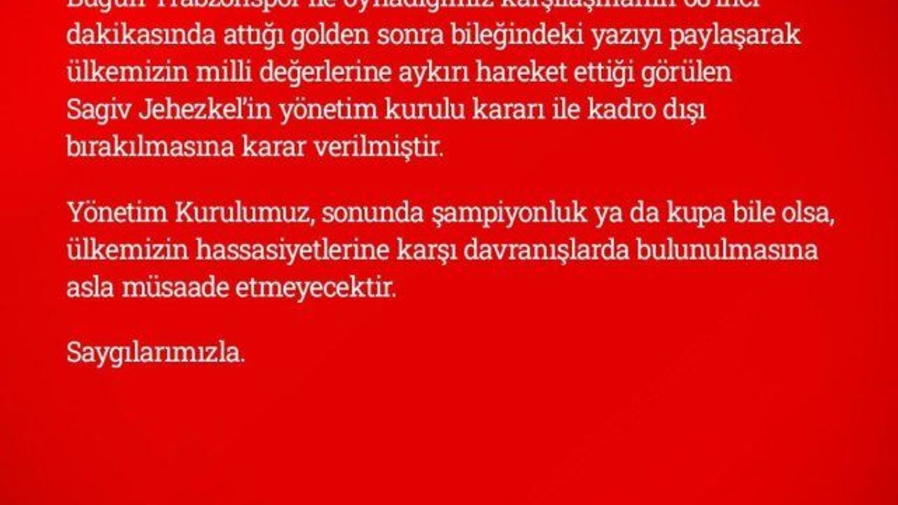 Antalyaspor'dan yapılan açıklamada şu ifadelere yer verildi: "Bugün Trabzonspor ile oynadığımız karşılaşmanın 68'inci dakikasında attığı golden sonra bileğindeki yazıyı paylaşarak ülkemizin milli değerlerine aykırı hareket ettiği görülen Sagiv Jehezkel'in yönetim kurulu kararı ile kadro dışı bırakılmasına karar verilmiştir. Yönetim Kurulumuz, sonunda şampiyonluk ya da kupa bile olsa, ülkemizin hassasiyetlerine karşı davranışlarda bulunulmasına asla müsaade etmeyecektir."