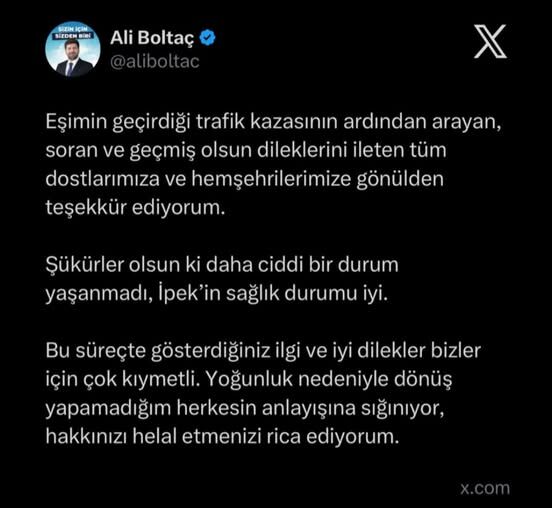 Başkan Boltaç, eşi İpek Boltaç’ın sağlık durumunun iyi olduğunu belirtirken kaza nedeniyle kendisini arayanlara da teşekkürlerini iletti.