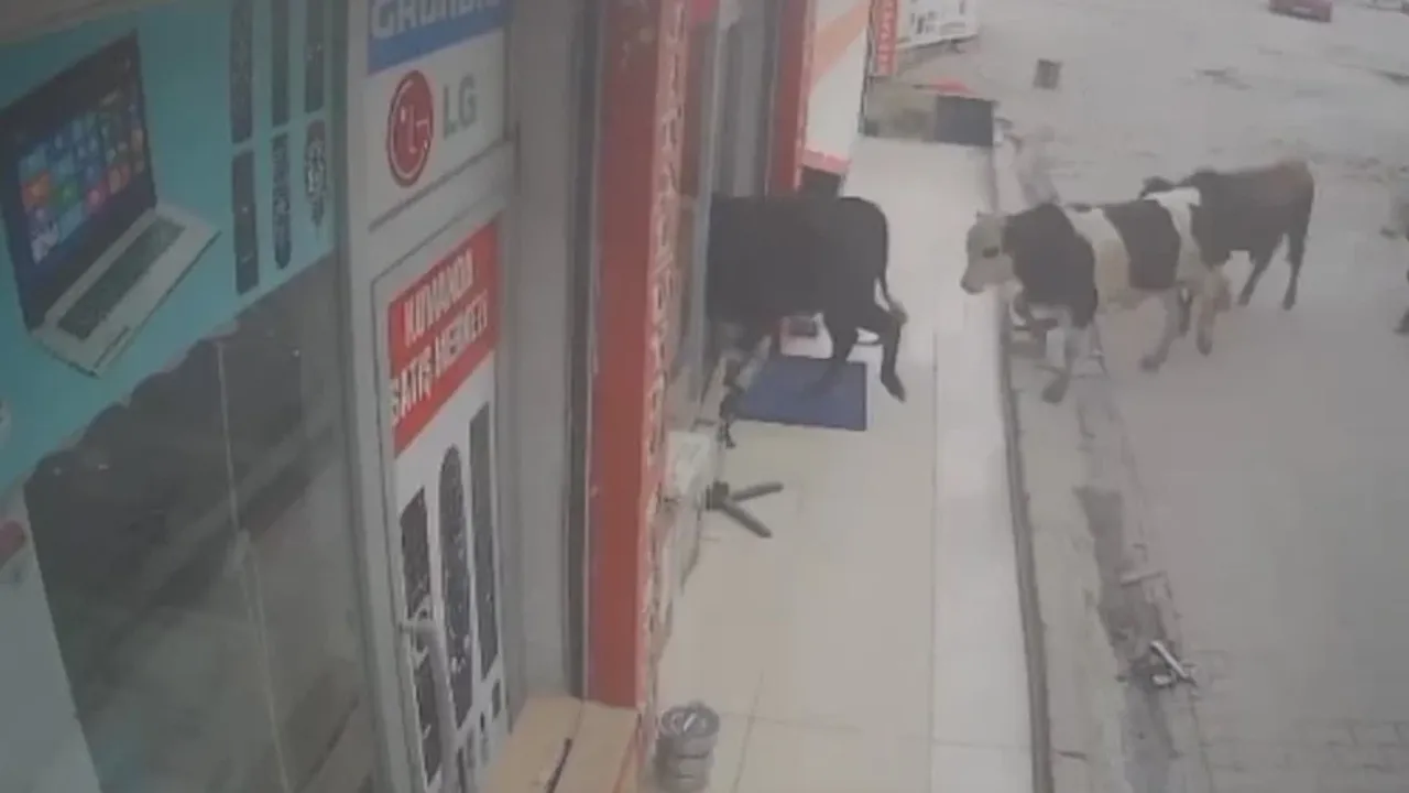 Görüntülerde, art arda koşturan ineklerin iş yerine girdiği, iş yerinin içinde gezinen inekleri gören esnafın dışarı çıkartmaya çalışması sonucu bazı eşyaların devrildiği ve ineklerin bir süre sonra iş yerinden çıktıkları yer alıyor.