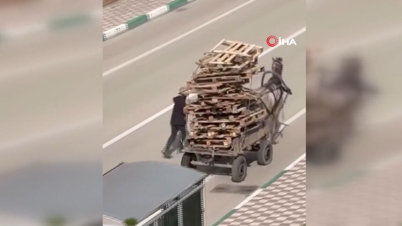 Bursa’nın Karacabey ilçesinde kimliği henüz öğrenilemeyen bir kişi, at arabasına kat kat palet yükledi. Aşırı yük nedeniyle yükün ağırlığı altında güçlükle ilerleyen atın dengesini sağlamakta zorlandığı anlar, çevrede bulunan bir vatandaş tarafından cep telefonu kamerasıyla kaydedildi.
