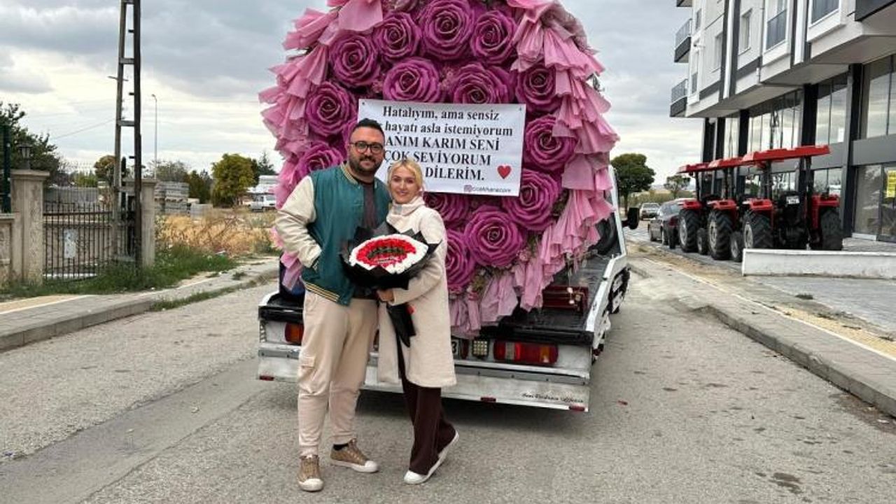 Akyurt’ta bugün görenleri hem şaşırtan hem de gülümseten bir olay yaşandı. Bir araç çekicisinin arkasına yerleştirilen dev buket çiçek dikkatleri üzerine çekti. Çiçeklerin yanında yer alan notta ise, "Hatalıyım, sensiz bir hayatı asla istemiyorum. Canım karım, seni çok seviyorum" ifadeleri yer aldı. Çekicinin önünden geçen vatandaşlar şaşırırken, sosyal medyada da hızla yayılan görüntü Akyurt’ta günün en çok konuşulan olayı haline geldi. Kimi "Gerçek aşk budur" derken, kimileri de "Ağabey sen ne yaptın da bu kadar özür diliyorsun" yorumunda bulundu.