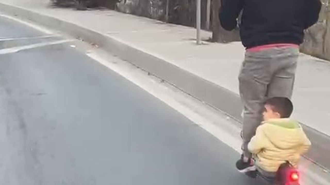 Görüntüler, dün öğle saatlerinde Sultangazi Yunus Emre Mahallesi Adem Yavuz Caddesi'nde kaydedildi. Araç trafiğinin yoğun olduğu caddede bir kişi, elektrikli skuterın arkasına küçük çocuğunu da alarak ilerlemeye başladı. Trafikte tehlikeli şekilde ilerleyen sürücüyü fark eden başka bir araç sürücüsü, o anları cep telefonu kamerasıyla görüntüledi.
