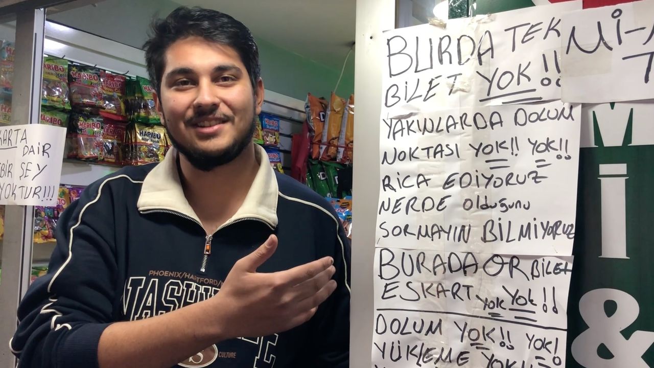 Üniversite Caddesi'nde bulunan bir market, toplu taşıma kartı olan ESKART ve tek kullanımlık bilet satışına yönelik sürekli gelen sorular nedeniyle bunalım yaşıyor. Bu duruma çözümü marketinin önüne astığı "Burada bilet yok, yakınlarda dolum noktası yok, rica ediyoruz nerede olduğunu sormayın bilmiyoruz, burada karekod bilet, ESKART yok, dolum yok, yükleme yok, yok yok yok yok" yazılarında bulan market sahibi Berkay Çetinkaya (23), bu hizmetleri bulundurmamasının sebebinin Büyükşehir Belediyesi'nin satışlardan yüzde 2 kâr vermesi olduğunu belirtti.