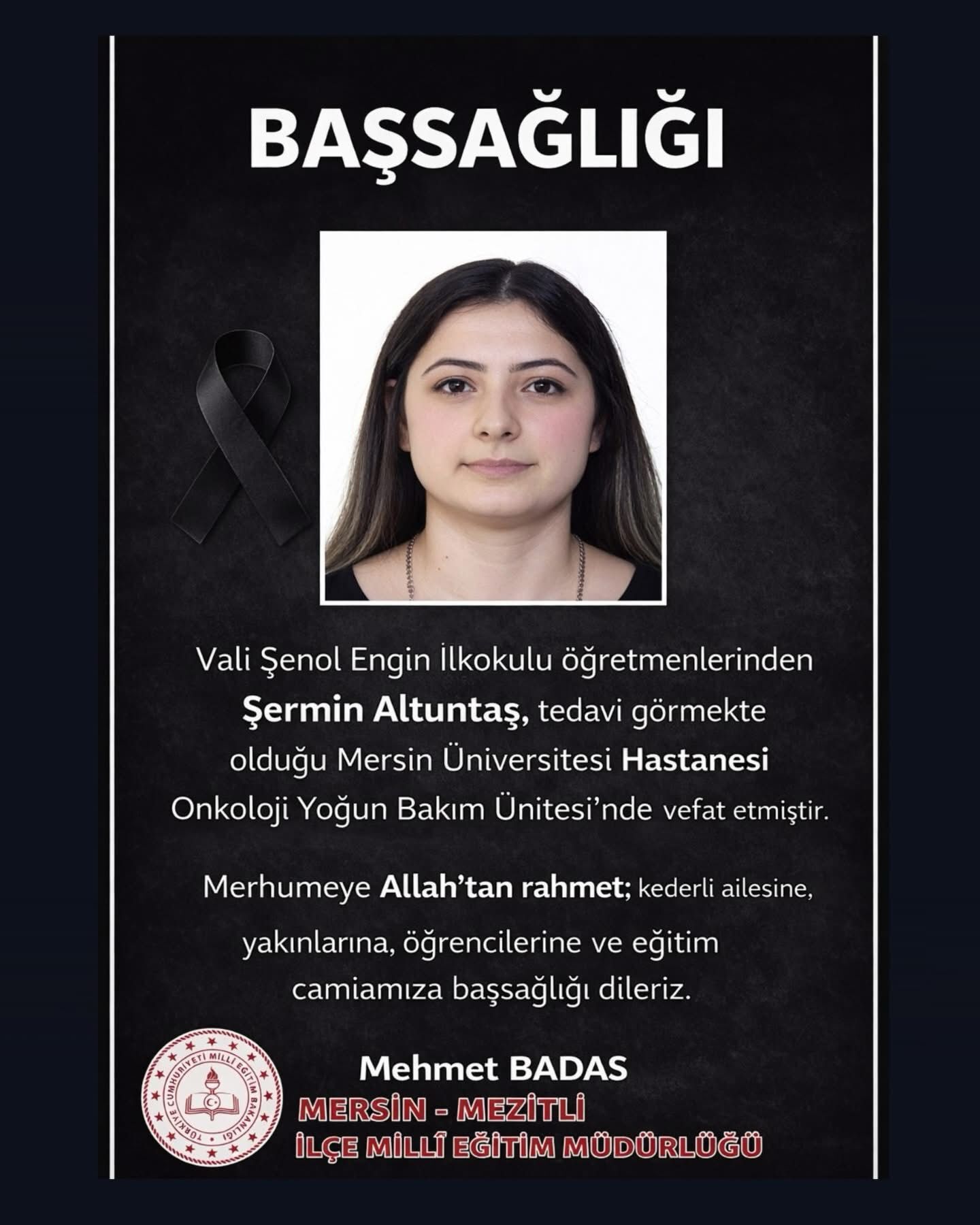 Mersin’de Vali Şenol Engin İlkokulu’nda öğretmenlik yapan 35 yaşındaki Şermin Altuntaş, bir yıl önce yakalandığı ilik kanseri nedeniyle tedavi görmeye başladı. Tedavisi Mersin Üniversitesi Hastanesi Onkoloji Bölümü Yoğun Bakım Ünitesinde devam eden genç öğretmen yapılan tüm müdahalelere rağmen kurtarılamayarak hayatını kaybetti. Evli ve 2 çocuk annesi Altuntaş’ın acı haberi ailesi, meslektaşları ve öğrencilerini yasa boğdu.