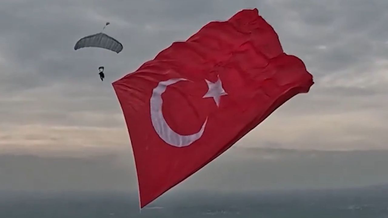 "Özel Kuvvetler Komutanlığı bünyesinde görev yapan İstihkam Astsubay Kıdemli Başçavuş Ertan Üstündağ, Geçitkale/KKTC'de 661,5 metrekarelik şanlı Türk bayrağımız ile serbest paraşüt atlayışı gerçekleştirerek Türkiye rekoru kırdı. Bayrağımız, standart bir basketbol sahasından 241,5 metrekare daha büyük. Denge için kullanılan kurşun plaka 50 kilogram. Tandem sistem toplam yükü 203 kilogram. Bir önceki rekor (531,2 metrekare) 2005 yılında kırılmıştı. Türk askeri, gökyüzünde de destan yazmaya devam ediyor."