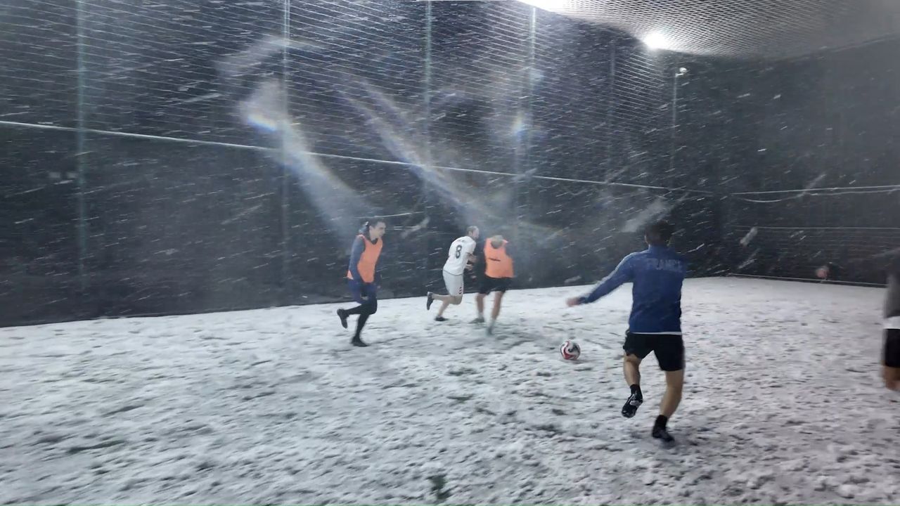 İstanbul’da akşam saatlerinde başlayan sağanak yağış, ilerleyen saatlerde yerini kara bıraktı. Kısa sürede etkisini artıran kar yağışı nedeniyle parklar, sokaklar ve çatılar beyaz örtüyle kaplandı. Soğuk havaya ve kar yağışına rağmen Maltepe’de halı saha maçı yapan bir grup futbolsever, karşılaşmalarını yarıda bırakmadı. Zemin şartlarının zorlaşmasına rağmen maçlarına devam eden oyuncular, halı sahada adeta beyaz örtü üzerinde mücadele etti.