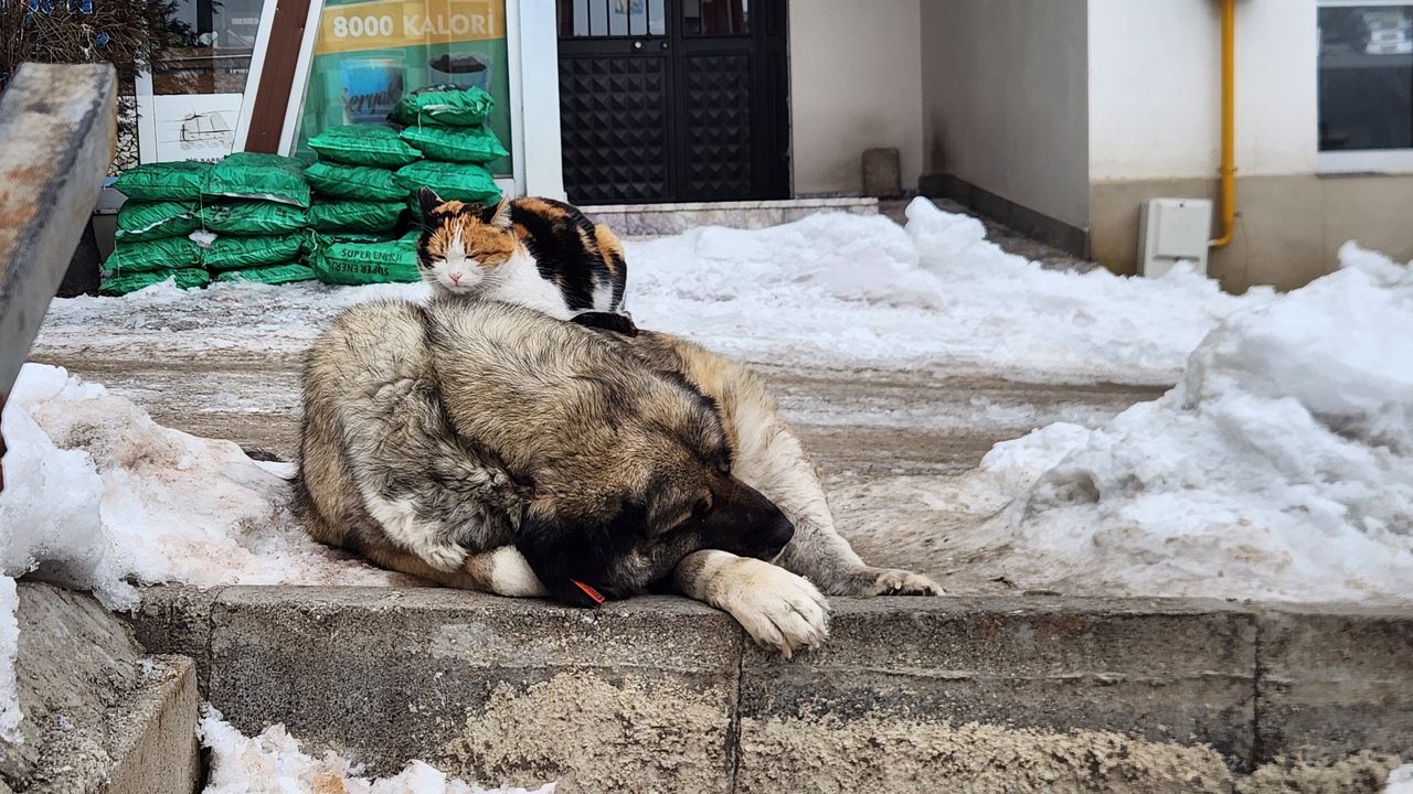 Tunceli'de etkisini sürdüren yoğun kar yağışı, buzlanma ve dondurucu soğuklara rağmen merkez Moğultay Mahallesinde kaydedilen görüntüler, yürekleri ısıttı. Sokakta uyuyan bir köpeğin sırtına çıkan kedi, soğuktan korunurcasına uzun süre burada bekledi. Köpeğin uyuduğu sırada kedinin sakinliği ve iki hayvan arasındaki sessiz uyum, çevredeki vatandaşların dikkatini çekti. Zorlu kış şartlarında ortaya çıkan bu görüntüler, sokak hayvanlarının birbirlerine nasıl sığındığını bir kez daha gözler önüne serdi.