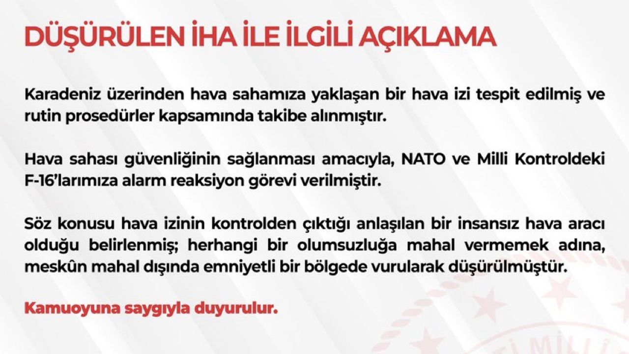 Bakanlığın açıklamasına göre, Karadeniz üzerinden hava sahasına yaklaşan bir hava izi tespit edildi. Takip sonucunda, hava izinin kontrolden çıktığı anlaşılan bir insansız hava aracı(İHA) olduğu tespit edildi. Rutin prosedürler kapsamında takibe alınan hava izine karşı, hava sahası güvenliğinin sağlanması amacıyla NATO ve Milli Kontroldeki F-16'lara alarm verildi.