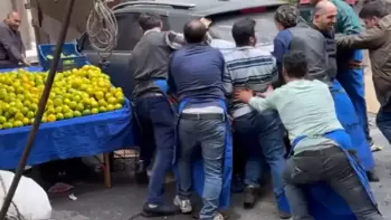 Yan duran aracın jantlarına halat geçiren pazarcılar hep birlikte otomobili çekmeye başladı. Otomobili pazarın bulunduğu sokaktan karşı kaldırıma geçiren pazarcılar daha sonra park etti. Önce ittirerek ardından da halatla çekerek aracı korunaklı bir yere alan pazarcılar daha sonra tazgahlarının başına geçti. O anlar cep telefonu kamerasına yansıdı.