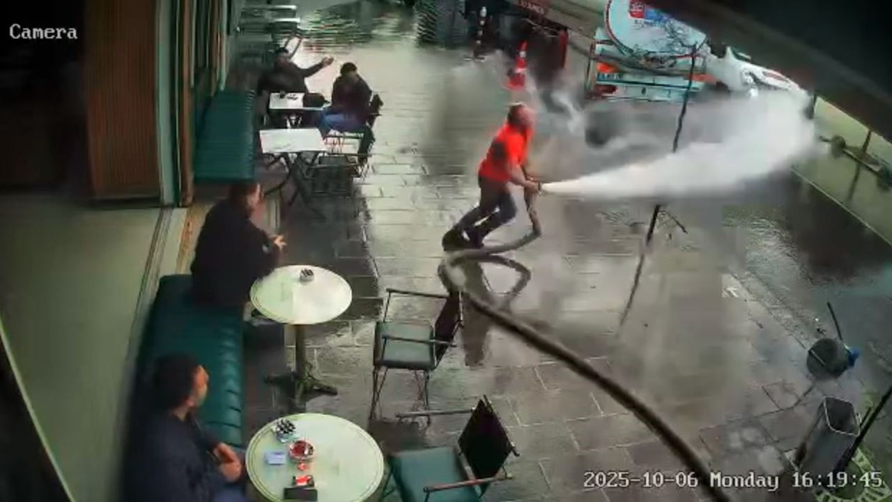 İstanbul Bayrampaşa’da bir kafe işletmecisi, iş yerinin önünü tazyikli su ile yıkamaya çalıştığı esnada hortumun kontrolünü kaybetti. Şov yapayım derken tazyikli suyun azizliğine uğrayan esnaf, kafe önünde çay içen müşterilerini ıslattı. Yaşanan o anlar kameraya yansıdı.