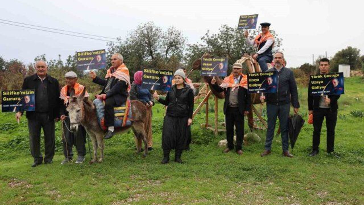 Mersin'in Silifke ilçesinde Yörükler, deve ve eşek sırtında ellerinde dövizlerle yürüyüş düzenleyerek Türkiye'nin ilk uzay yolcusu hemşehrileri Alper Gezeravcı'ya destek verdi.