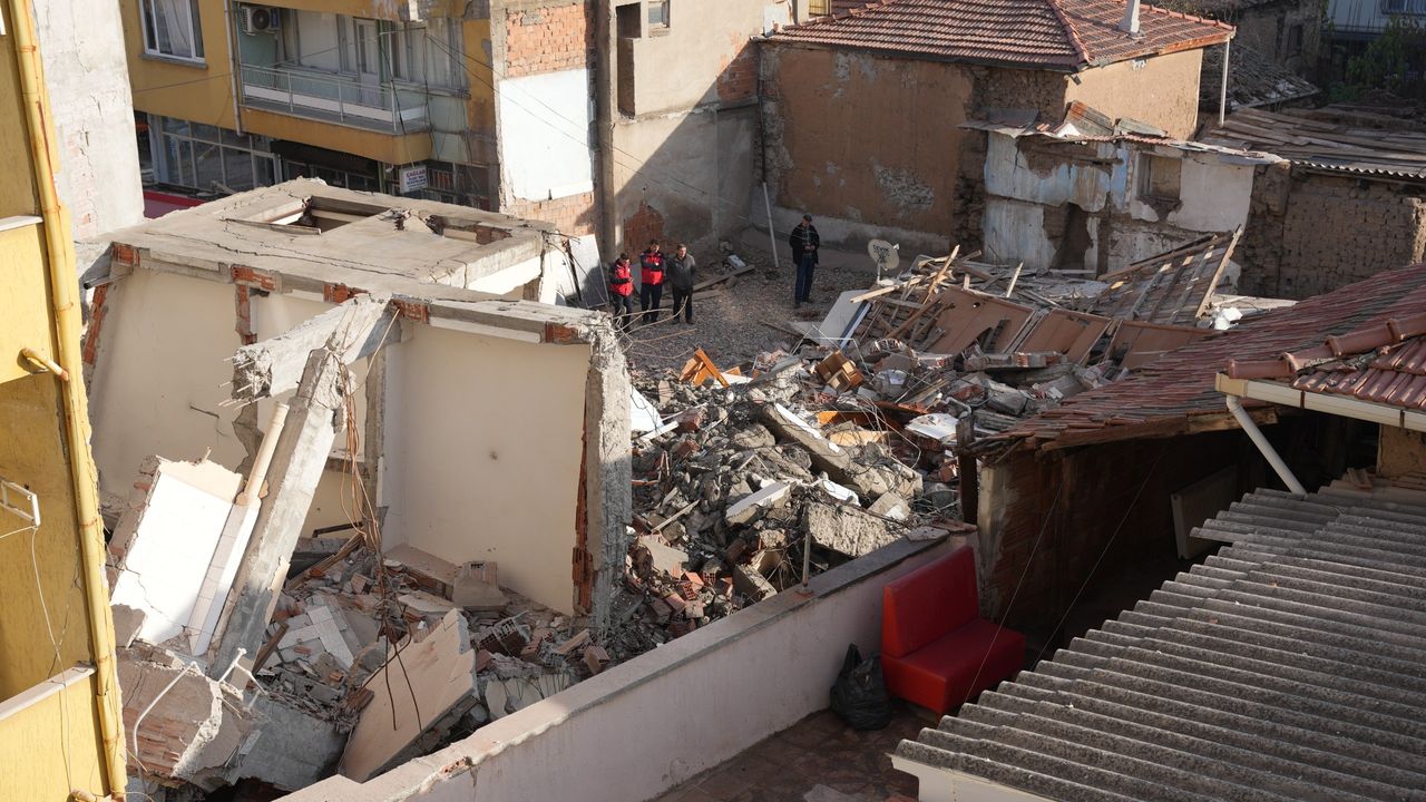 Balıkesir'in Sındırgı ilçesinde 27 Ekim'de meydana gelen depremin izleri silinmeye çalışılırken, kontrollü yıkım sırasında yaşanan bir olay yürekleri ağza getirdi. Hasarlı bir binanın yıkımı sırasında, hemen karşısında bulunan konteyner dükkân enkaz altında kaldı, iş makinesi oporatörün dikkatiyle kurtuldu.